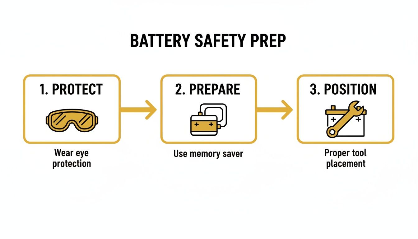 This flowchart outlines the foundational safety preparation: protect yourself, prepare the vehicle, and position your tools correctly before touching a terminal.