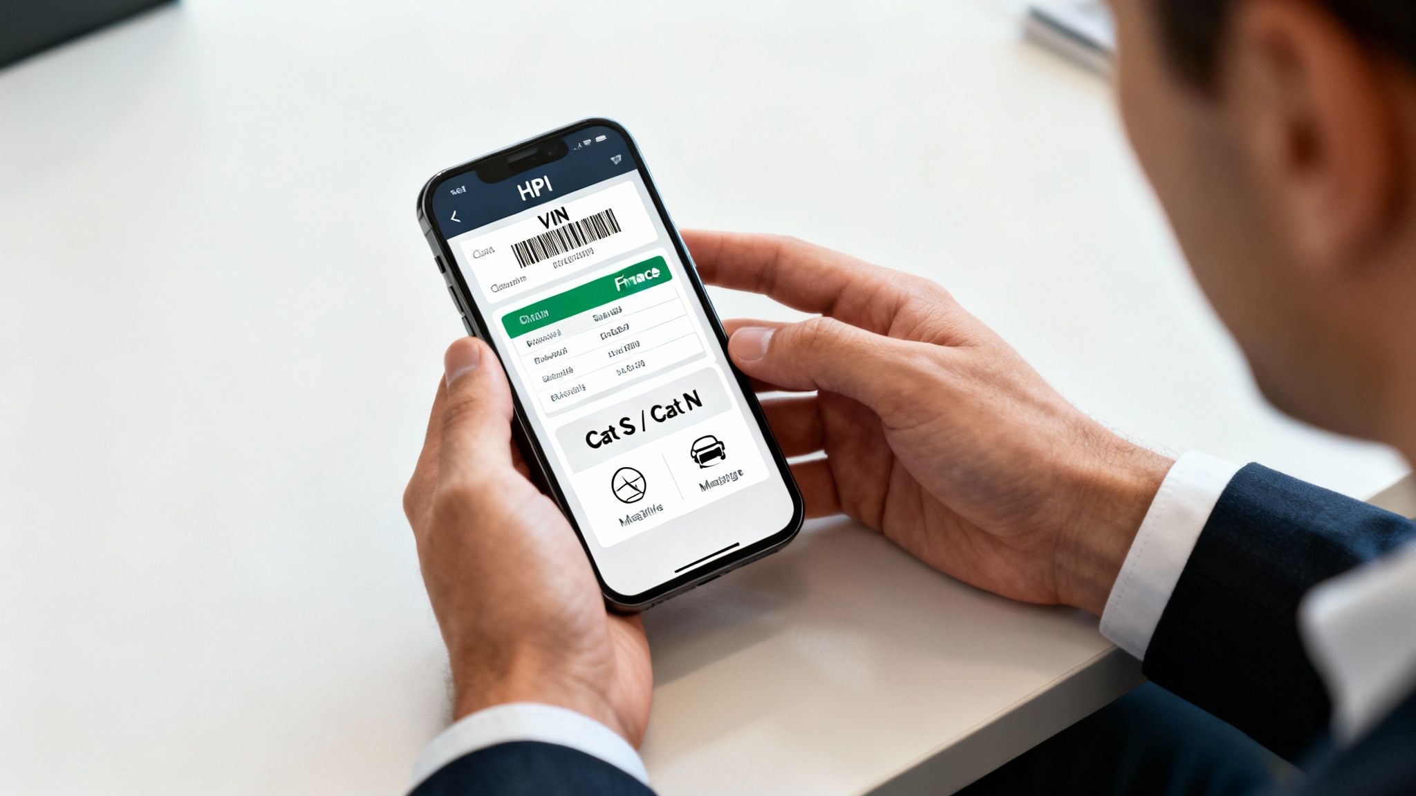 A professional check will nail down key information for you. It confirms if there is any outstanding finance; a vehicle with an active finance agreement is still the property of the lender. Buy one by mistake, and you risk it being repossessed, leaving you massively out of pocket. You can learn more about why this is so critical in our detailed guide on finance checks. The system also cross-references the vehicle with the Police National Computer (PNC) to confirm it hasn't been reported as a stolen vehicle. It instantly identifies if a vehicle has been declared a write-off (like a Cat S or Cat N), which seriously impacts its valuation and how you market it. Finally, the check compares the current mileage against a database of millions of records to flag potential "clocking" and protect you from mileage discrepancies and fraud.